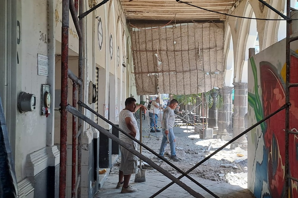 Un desplome parcial de estructura registrado la tarde de este martes en el Portal Medellín, en pleno centro de la ciudad, generó la movilización de elementos de Protección Civil Municipal, luego de que durante trabajos de mejoramiento se desprendiera parte del plafón y estructura del inmueble.