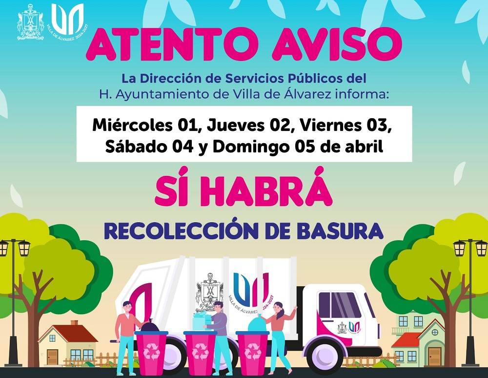 Villa de Álvarez, Col. El Ayuntamiento de Villa de Álvarez, a través de la Dirección de Servicios Públicos, informa a la población que los días miércoles 01, jueves 02, viernes 03, sábado 04 de abril y domingo 05 de la Semana Santa, la recolección de basura en las colonias y comunidades del municipio se realizará de manera normal.