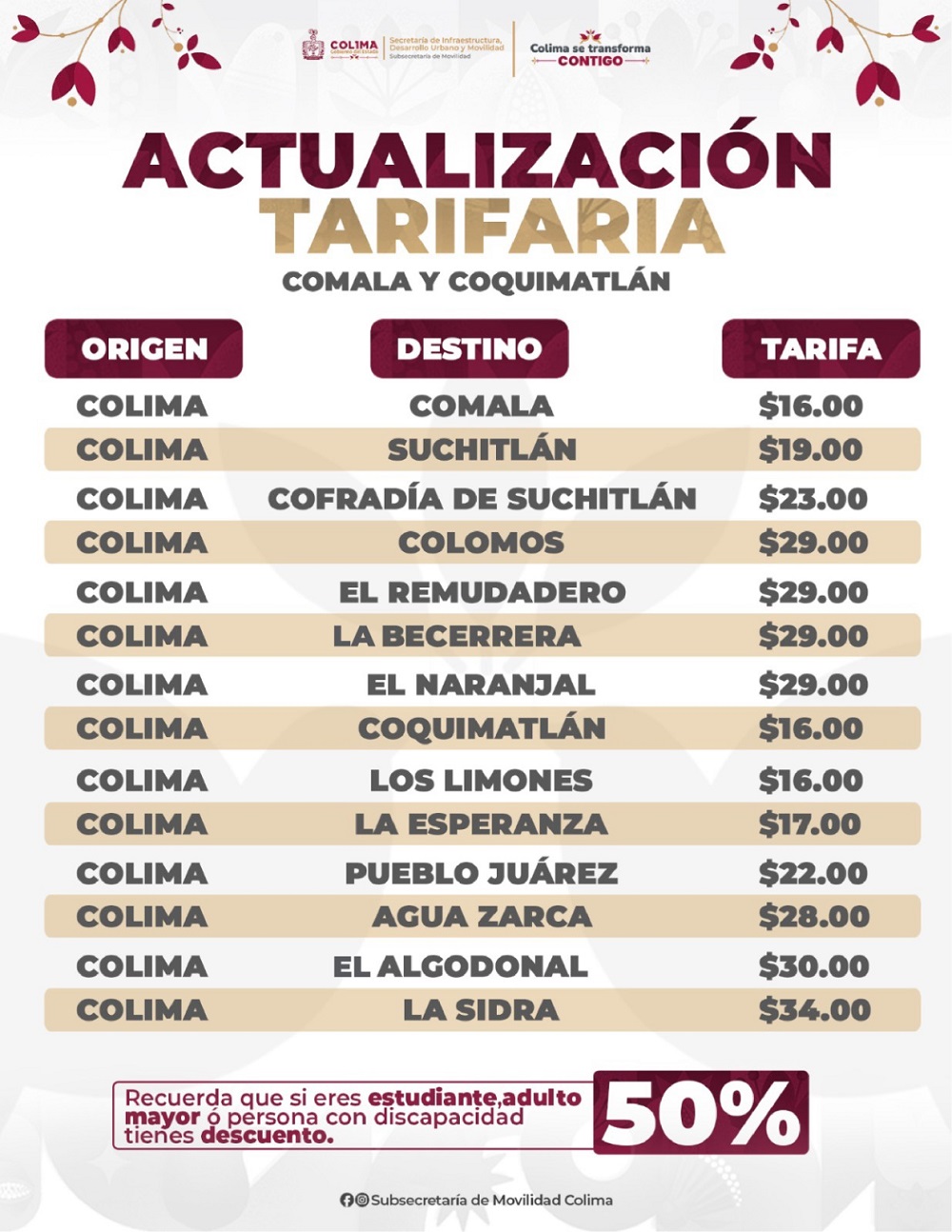La Subsecretaría de Movilidad (SUBSEMOV) del Gobierno del Estado de Colima dio a conocer en conferencia de prensa acciones prioritarias de su agenda operativa, así como la actualización tarifaria que se informa en gráfico anexo, además del estatus de trámites vehiculares.