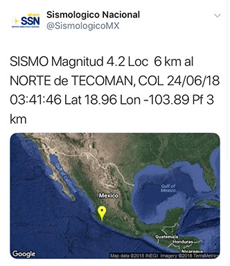 De acuerdo al Servicio Sismológico Nacional (SSN) el movimiento telúrico magnitud 4.2 grados se registró a las 3:41 horas de este domingo, con epicentro a 6 kilómetros al norte de Tecomán.