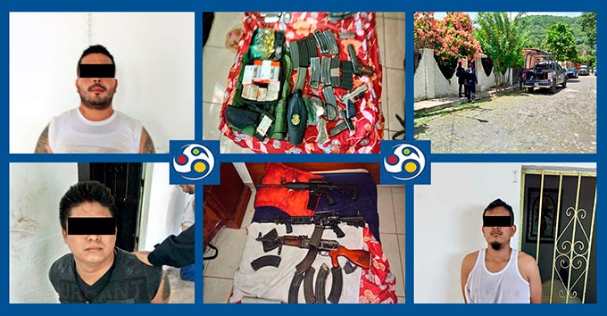 A los detenidos, siendo originarios de Nayarit, Guerrero y Colima, respectivamente, se les aseguraron cuatro armas de fuego largas, cuatro cortas, diversos cartuchos útiles de diferentes calibres, así como tres vehículos y una motocicleta.