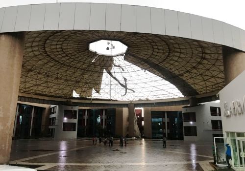 Debido a lo fuerte del viento, parte de la lona que cubre el domo central del Complejo Administrativo fue destruido, cayendo en pedazos la techumbre.