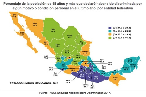 Según dicha información de esta Encuesta Puebla tiene el mayor porcentaje de discriminación (28.4% de prevalencia), Colima (25.6%), Guerrero (25%), Oaxaca (24.9%) y Morelos (24.4%).