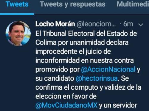 El Tribunal Electoral del Estado de Colima por unanimidad declaró improcedente el juicio de inconformidad en contra de Leoncio Alfonso Morán Sánchez, candidato de Movimiento Ciudadano a la alcaldía capitalina, el cual fue promovido por el Partido Acción Nacional y su candidato Héctor Insúa García.