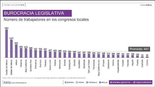 Con 90 trabajadores, el Congreso del Estado de Colima es el que menos servidores públicos tiene, cifra ampliamente superada por los mil 991 trabajadores de la Asamblea de la Ciudad de México, los mil 277 del Congreso del Estado de México, los 943 del Congreso del Estado de Jalisco y hasta por el promedio nacional, que es de 441.