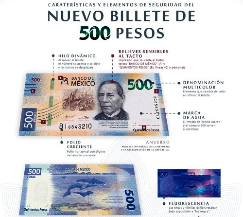 En el nuevo billete se plasma nuestro legado histórico y riqueza natural, explica el banco central. Con novedosos elementos de seguridad, como denominación multicolor e hilo dinámico. Con la marca de agua, el retrato de Benito Juárez y el número 500 se ven a contraluz.