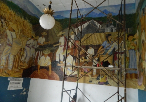 Comala, Col. El mural llamado "Comala y su Cultura", localizado en la entrada a la Presidencia Municipal de Comala, será restaurado por las restauradoras Wendolín Hernández Corona y Daniela Cedeño.
