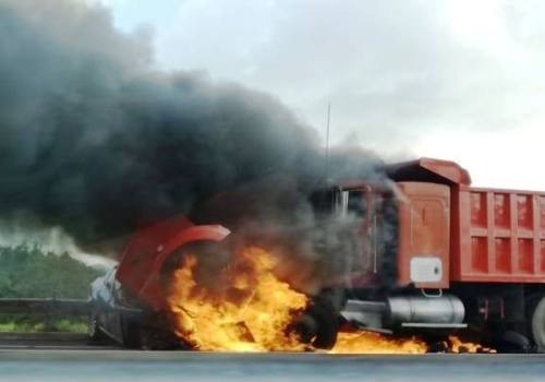 De acuerdo a información preliminar los hechos se registraron esta tarde cuando el camión de volteo impactó fuertemente a un automóvil compacto, para de manera casi inmediata, al parecer, el motor del camión se incendió, extendiéndose las llamas hasta alcanzar la unidad compacta.