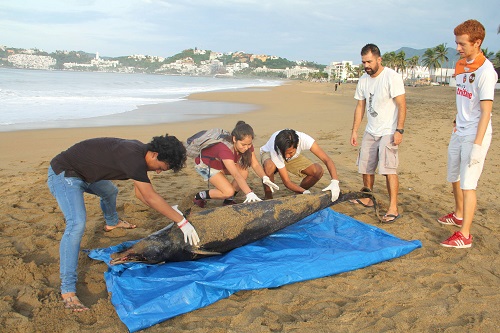 Estudiantes de tercer semestre de la carrera de Oceanología de la Facultad de Ciencias Marinas de la Universidad de Colima, junto con Christian Daniel Ortega Ortiz, profesor de este mismo plantel, así como personal de la PROFEPA del estado de Colima, levantaron hace unos días un mamífero marino varado en las costas de Manzanillo.