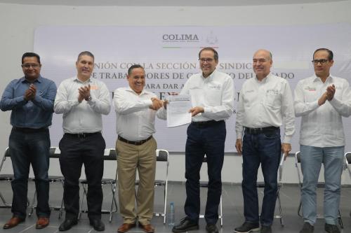 El gobernador José Ignacio Peralta Sánchez entregó de manera simbólica la publicación de la Ley de Pensiones en el Periódico Oficial al Sindicato de Trabajadores al Servicio del Gobierno del Estado (STSGE), a la Sección 39 del Sindicato Nacional de Trabajadores de la Educación (SNTE) y a la Unión de Sindicatos del Estado de Colima.