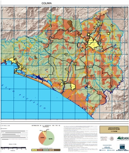 En colaboración con el Registro Agrario Nacional (RAN), el Instituto Nacional de Estadística y Geografía (INEGI) desarrolló la Carta Catastral de Colima para presentar a las Unidades del Estado y a la sociedad en general, un mapa que muestra la distribución y estructura generalizadas del territorio de la entidad por tipo de propiedad: social, privada y pública.