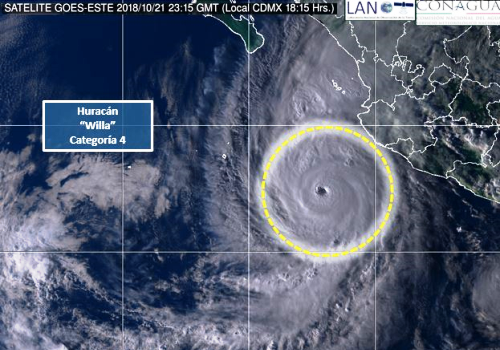 Durante la tarde de hoy, Willa se intensificó a huracán de categoría 4 en la escala Saffir-Simpson. Se ubicó a 320 kilómetros (km) al suroeste de Playa Pérula y a 370 km al sur-suroeste de Cabo Corrientes, ambas localidades de Jalisco, con vientos máximos sostenidos de 215 km/h, rachas de 250 km/h y desplazamiento al nor-noroeste a 9 km/h, informó el Servicio Meteorológico Nacional (SMN), dependiente de la Comisión Nacional del Agua (Conagua).