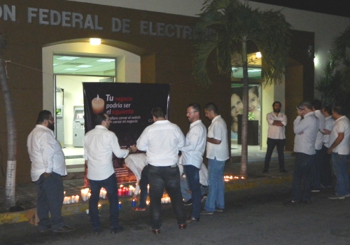 Los restauranteros se instalaron afuera de las oficinas de la CFE, ubicadas por la calle Torres Quintero de Colima, colocando las veladoras, que utilizaron durante la anterior campaña en donde apagaron las luces de sus negocios durante dos horas (de 7 a 9 de la tarde), en la banqueta de la paraestatal.