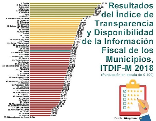 El Índice de Transparencia y Disponibilidad de la Información Fiscal de los Municipios 2018 comprende una muestra de 60 ayuntamientos (incluidas las 31 capitales) que concentran más de 30 por ciento de la población nacional.