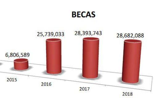 Ejemplificó el caso de las becas, rubro donde cada vez se invierte mayores recursos, ya que en el 2015 fueron 6 millones 806 mil 589 pesos; en el 2016, 25 millones 739 mil 033; en el 2017, 28 millones 393 mil 743 pesos y en lo que va del 2018, se alcanzó la cantidad histórica de 28 millones 682 mil 88 pesos.