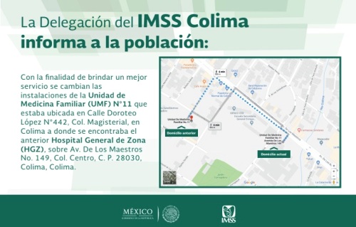 La Delegación del Instituto Mexicano del Seguro Social (IMSS) en Colima informa que con la finalidad de brindar un mejor servicio se cambian las instalaciones de la Unidad de Medicina Familiar (UMF) N°11 que estaba ubicada en Calle Doroteo López N°442, Col. Magisterial, en Colima a donde se encontraba el anterior Hospital General de Zona (HGZ), sobre Av. De Los Maestros No. 149, Col. Centro, en Colima.