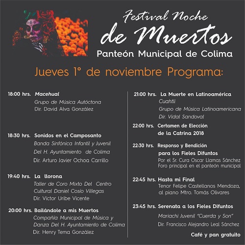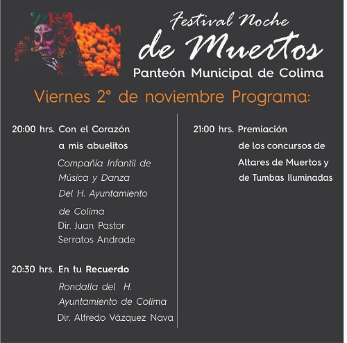 El Panteón Municipal, permanecerá abierto toda la noche y el 2 de noviembre, continuaremos con las actividades del Festival Noche de Muertos, entre las que destacan, la presentación a las 8:00 de la noche de la Compañía Infantil de Música y Danza del Ayuntamiento de Colima.