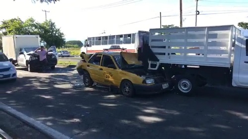 Ahí, cuatro vehículos se vieron involucrados en una carambola, en donde el conductor de un vehículo Nissan Tsuru color tinto impactándosele en la parte posterior a un taxi, provocando que éste a su vez golpeara a una camioneta Nissan Pick-Up. Destaca que luego de que el vehículo Tsuru se moviera del lugar del impacto, el conductor de una camioneta Nissan en una distracción golpeo al taxi.