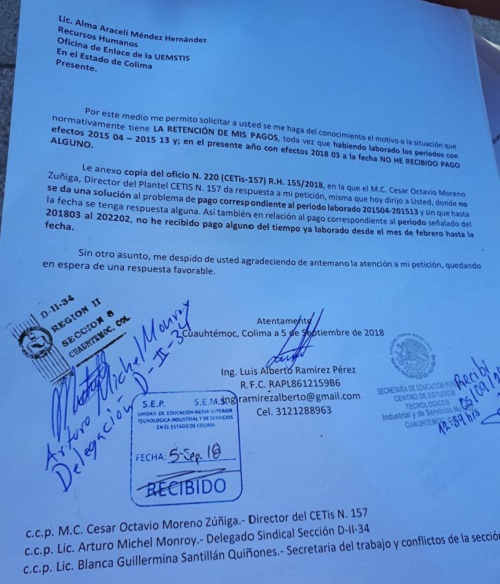 El director del plantel donde labora Ctis 157 César Moreno Zúñiga, le ha señalado que siguen sin darle una instrucción que no hay respuesta, misma que repite Araceli Méndez en la Secretaría de Educación en la SEP que es de Recursos Humanos en la Educación de Media Superior.