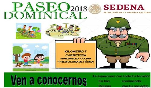 La Secretaría de la Defensa Nacional, a través de la Comandancia de la 20/a. Zona Militar, tiene el agrado de invitar a la sociedad colimense a ejercitarse, divertirse y convivir en compañía de su familia en un lugar seguro y de sano esparcimiento, durante el paseo dominical a realizarse de las 9:00 a las 13:00 horas del domingo 16 de diciembre de 2018, en las nuevas instalaciones del Campo Militar 20-A; (Predio Loma de Fátima) ubicado en el km. 7 de la carretera federal Colima-Manzanillo (Con dirección a Colima).