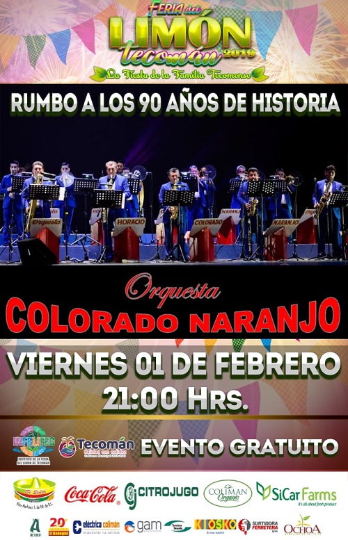 En el Foro de los Conciertos gratuitos de la Feria del Limón, Tecomán 2019 el 01 de febrero a las 21:00 horas, se presenta una agrupación de gran tradición en el estado de Colima; con casi 90 años de su fundación, la Orquesta Colorado Naranjo hará una presentación especial por toda esa trayectoria.