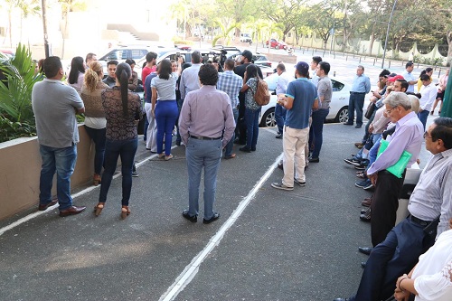 A través de las cuatro salidas de emergencia, docenas de personas respondieron el llamado que a las 10 en punto de la mañana se hizo a través de las sirenas del inmueble y de una patrulla de la Policía Estatal, para evacuar en orden el edificio del Poder Legislativo.