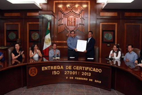 El rector José Eduardo Hernández Nava recibió el certificado ISO 27001:2013, con vigencia por tres años, del organismo certificador International Northern Registrar (INR), el cual avaló 15 procesos administrativos de la Universidad de Colima relacionados con la gestión (manejo y protección) de la seguridad de la información institucional.