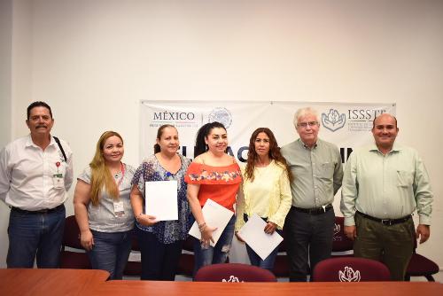 Reunidos en la sala de juntas de la delegación estatal del ISSSTE, las trabajadoras María de la Luz Cruz Carrillo, Daix Mirella Heredia López y Celia Velázquez Molina; fueron quienes recibieron de manera simbólica los certificados de bachillerato de manos de Raymundo Alberto Covarrubias y de Carlos Vizcaíno Martínez.