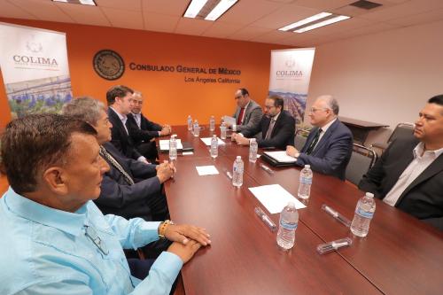 En un encuentro celebrado en el consulado general de México en Los Ángeles, el mandatorio estatal estuvo acompañado por el secretario desarrollo rural del Gobierno del Estado, Sergio Agustín Morales Anguiano, así como por los empresarios José Alvarez Chávez, Miguel Ángel Plascencia, Martel Martínez Jiménez y Hugo Herrera Mier.
