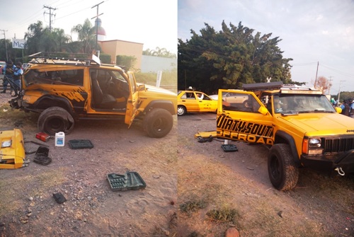 Dos personas resultaron lesionadas luego que el tren se llevara a una camioneta marca Jeep color amarillo cuando ésta intentó ganarle el paso en el libramiento sur, de la ciudad de Colima.