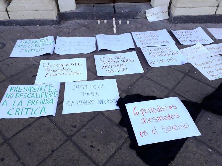 Luego del asesinato del comunicador Santiago Barroso suscitado en Sonora, los periodistas colimenses se manifestaron afuera de Palacio de Gobierno, en donde mostraron pancartas que señalaban “Justicia para Santiago Barroso”, “Presidente no descalifique a la prensa crítica”, “Ustedes quieren votos, nosotros justicia”, “6 periodistas asesinados en lo que va del año ¡Ni uno más!”, “Garantías para el periodismo crítico”, entre otras.