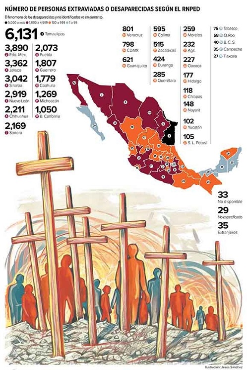 Según el RNPED, Tamaulipas es la entidad que registra mayor número de personas extraviadas o desaparecidas, con seis mil 131, le sigue el Estado de México, con tres mil 890, después Jalisco, con tres mil 362, Sinaloa (3,042), Nuevo León (2,919), Chihuahua (2,211).