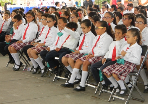 El secretario de Educación, Jaime Flores Merlo, encabezó la entrega simbólica de mil 100 lentes oculares para alumnado del municipio de Colima que fueron donados por la empresa Contecon, Manzanillo, en evento desarrollado en la Escuela primaria Gregorio Torres Quintero de Colima.