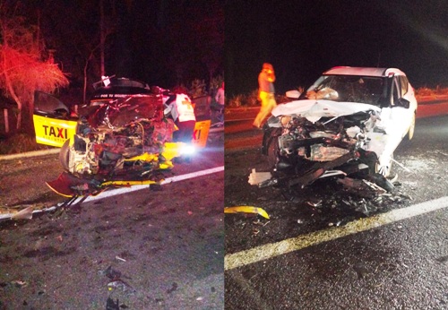 Manzanillo, Col. Dos personas lesionadas de gravedad y pérdida total de dos vehículos fue el saldo que dejó el choque de frente entre un taxi ejecutivo y una camioneta particular ocurrido la noche de este jueves por la carretera Manzanillo- Cihuatlán, unos metros antes del entronque del aeropuerto Playa de Oro.