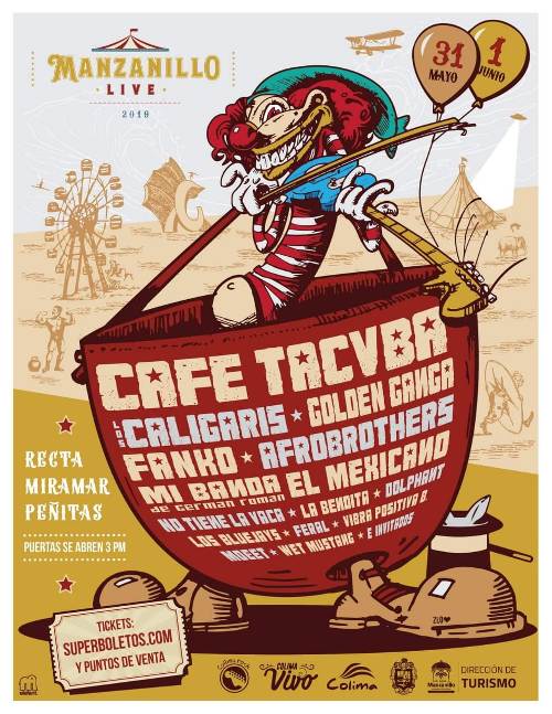 EL festival Manzanillo Live se celebra este 2019 el 31 de mayo y 1 de junio en la playa de Miramar, los boletos se encuentran disponibles en www.superboletos.com y en otros puntos de venta: Clandestino Tecomán Tienda (Tecomán); DMT Rock-Bar (Colima), Clandestino (Colima/