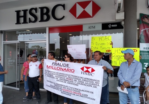 Un grupo de usuarios del Banco HSBC se manifestaron esta tarde en la sucursal de Plaza Colima (Soriana) en Villa de Álvarez, ya que acusan a esta institución bancaria de llevar a cabo fraude cibernético en su contra por lo que exigen el reembolso de su dinero.