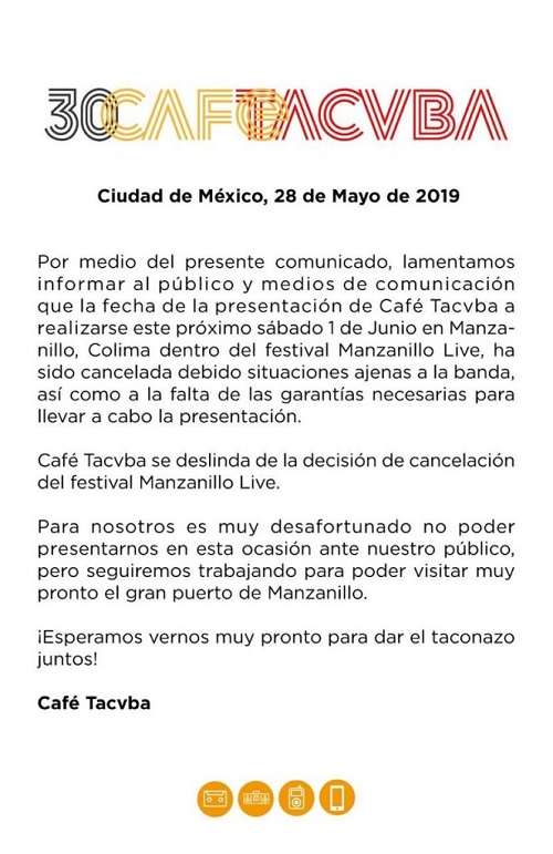 "La presentación de Café Tacvba ha realizarse este próximo sábado 1 de junio en Manzanillo, Colima, dentro del Festival Manzanillo Live, ha sido cancelada debido a situaciones ajenas a la banda, así como la falta de garantías necesarias para llevar a cabo la presentación".