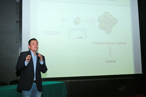Durante la charla, comentó que un tumor cancerígeno debe dejarse de ver como una célula que ha proliferado, para analizarse como un conjunto de componentes; “ésa es una visión errónea de la mayoría de quienes nos dedicamos a la investigación, porque no hay que ver al tumor como una sola célula, sino como un conjunto organizado en el que existen otros componentes que forman parte del tumor”.