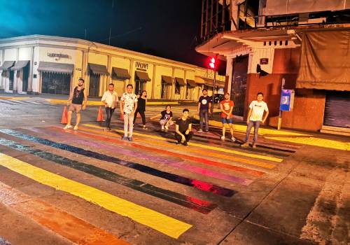 Activistas de la Comunidad Lesbico, Gay, Bisexual y Trans pintaron una bandera multicolor en el cruce peatonal que se encuentra en sobre la Avenida principal de la Capital colimense, en el Centro Histórico.