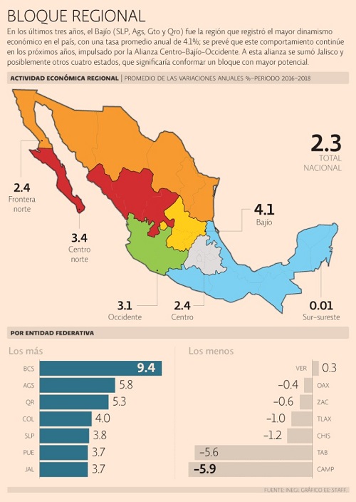 Las cinco entidades conforman la Alianza Centro-Bajío-Occidente, surge como una propuesta de los gobernadores para crear estrategias regionales por medio de un corredor que aglomera diversas ramas productivas, destacó este martes el periódico El Economista en sus páginas.