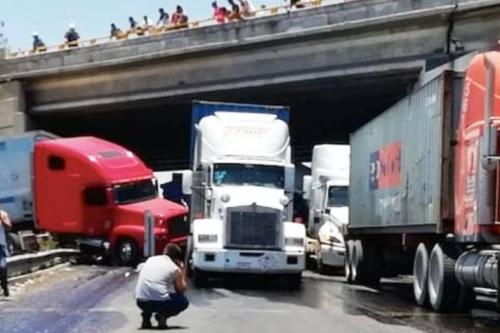 Los hechos ocurrieron este sábado alrededor de las dos de la tarde, cuando sobre el libramiento Tapeixtles circulaba un tráiler, metros antes de llegar al entronque con la autopista intentó frenar, pero los frenos no le respondieron por lo que chocó por alcance, originando una carambola de 4 tracto camiones y un auto compacto, quedando prensada la conductora de ésta última unidad, por lo que fue necesario que intervinieran los cuerpos de rescate para liberarla.