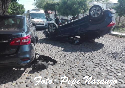 Comala, Col. La falta de pericia de un par de jóvenes provocó este aparatoso accidente en la calle Insurgentes de la Colonia “La Trinidad” en Comala, que al chocar con un automóvil estacionado se voltearon; afortunadamente no hubo víctimas mortales que lamentar y todo quedó en el susto para ambos jóvenes y los daños materiales.