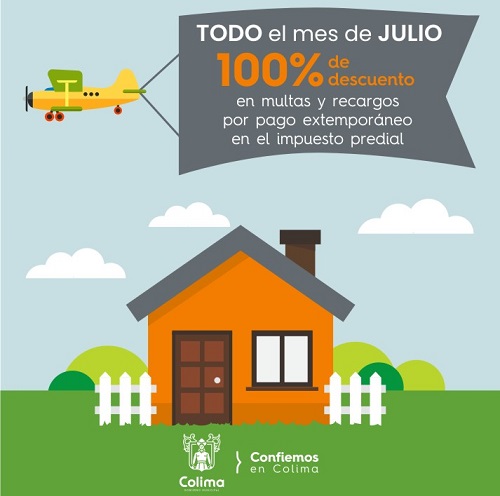 El Ayuntamiento de Colima, a través de la Tesorería Municipal, le recuerda a la población que este mes de julio sigue vigente el periodo de descuentos del 100 por ciento en multas y recargos en adeudos del impuesto predial, del ejercicio fiscal 2019 y anteriores, mismos que estarán vigentes hasta el día 31 de agosto del año en curso.