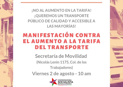 La Coordinadora Socialista Revolucionaria (CSR) entregará al titular de la Secretaría de Movilidad, Rafael Martínez Brun, el día de mañana viernes 02 de agostó las firmas, además realizarán un mitin en la Secretaría en forma de protesta por el aumento al transporte público.