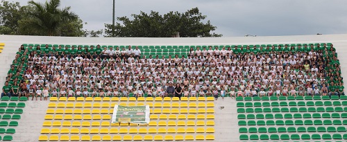 El rector, acompañado por Alicia López de Hernández, directora general del CEDEFU y presidenta del Voluntariado Universitario, posó junto a los pequeños en las graderías del Estadio Olímpico Universitario.