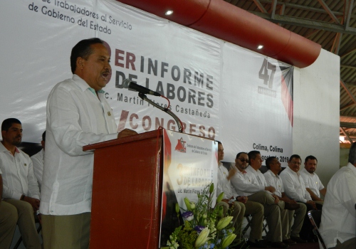 Martín Flores Castañeda, Secretario General del Sindicato de trabajadores al Servicio del Gobierno del Estado (STSGE), rindió su Tercer Informe de Labores al frente de este organismo, en donde pidió al Gobernador del estado, Ignacio Peralta Sánchez, que intervenga para solucionar el retraso de tres meses que se tiene en el pago de aportaciones al Instituto de Pensiones de Colima.