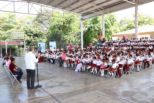 En evento desarrollado en la cancha techada de la comunidad, Flores Merlo refirió que en esta entrega masiva se beneficia a alumnas y alumnos de los planteles educativos Preescolar José Juan Ortega; Escuela Primaria Gorgonio Ávalos en ambos turnos; así como a la Escuela Secundaria 28 de febrero TM.