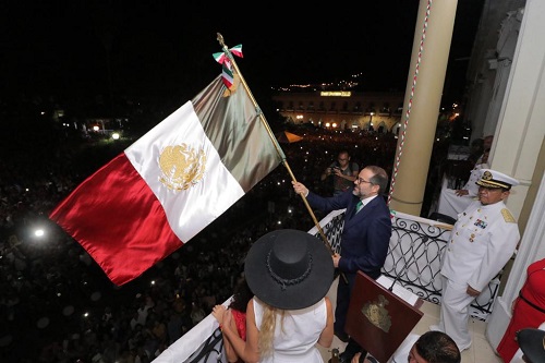 “Colimenses: ¡Viva la Independencia nacional; vivan los héroes que nos dieron patria y libertad, viva Hidalgo; viva Morelos; viva Matamoros, viva Allende; viva Josefa Ortiz de Domínguez; viva Aldama; viva Abasolo, viva Guerrero!”, exclamó el gobernador, portando la bandera de México desde el balcón central de Palacio de Gobierno.