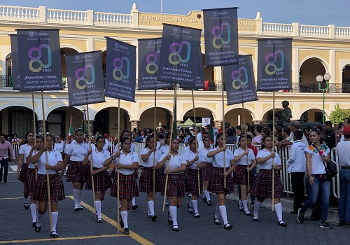 Los estandartes representativos de la Universidad de Colima fueron portados por los alumnos de los diferentes planteles, acompañados por la escolta de bandera, la banda de música y bandas de guerra, que avanzaron a lo largo de los dos kilómetros del recorrido.