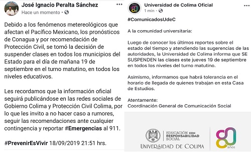 Luego de conocer los últimos reportes sobre el estado del tiempo y atendiendo las sugerencias de las autoridades, la Universidad de Colima informa que SE SUSPENDEN las clases este jueves 19 de septiembre en todos los niveles del turno matutino.